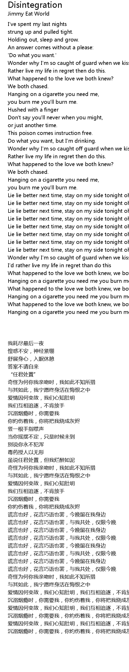 Hanging on a cigarette you need me you burn me you'll burn me. |