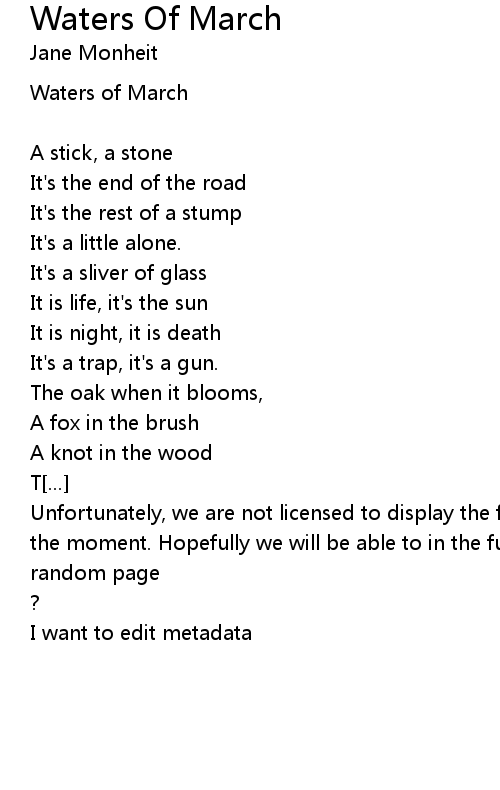 | Unfortunately, we are not licensed to display the full lyrics for this song at the moment. Hopefully we will be able to in the future. Until then, how about a | |