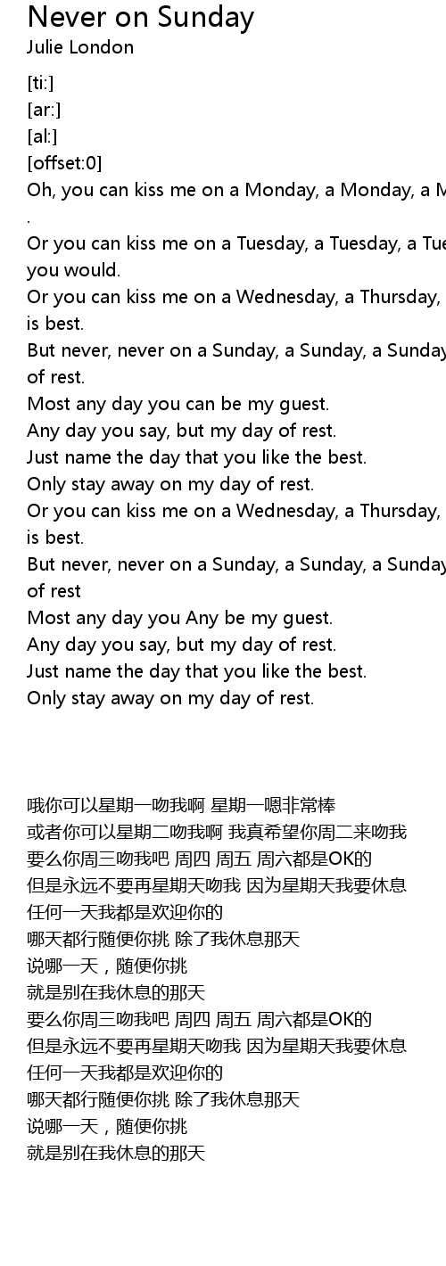 But never, never on a Sunday, a Sunday, a Sunday, cause that' s my day of rest. |