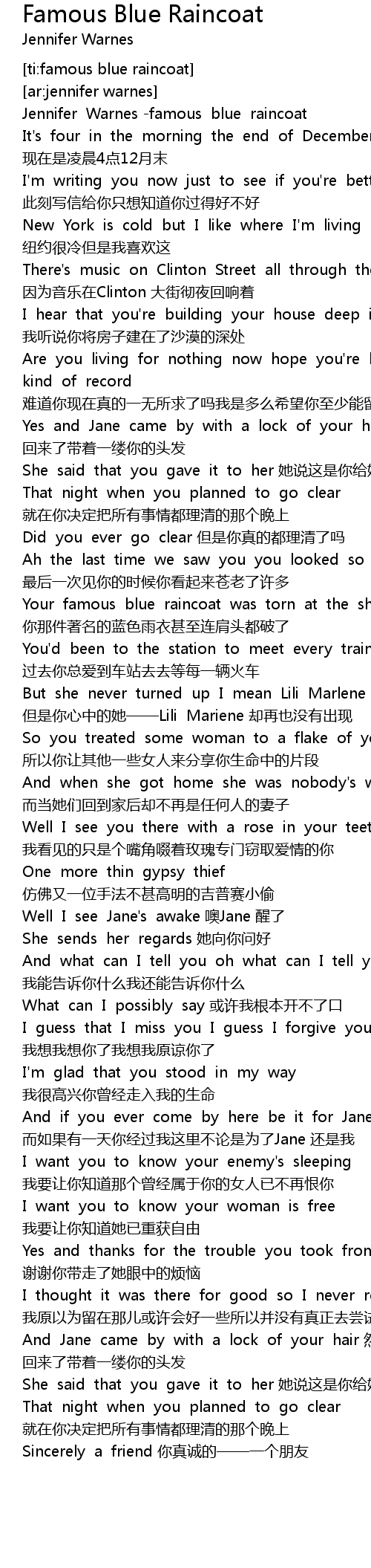 | [01:52.62] | Your famous blue raincoat was torn at the shoulder nǐ nà jiàn zhù míng de lán sè yǔ yī shèn zhì lián jiān tóu dōu pò le |