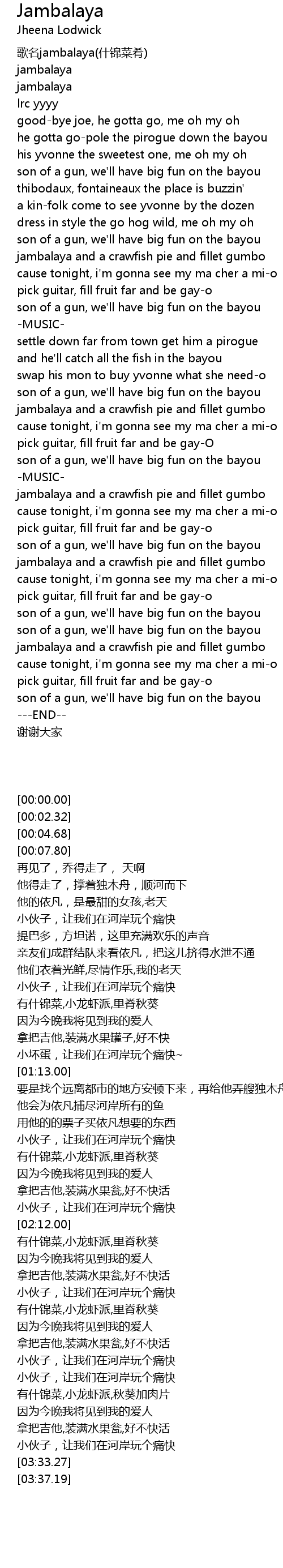 | [00:00.00] | 歌名jambalaya(什锦菜肴) |