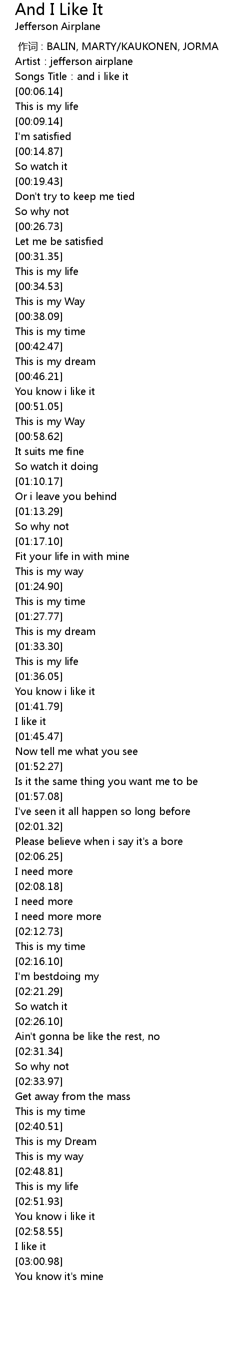 | [00:00.00] | 作词 : BALIN, MARTY/KAUKONEN, JORMA |