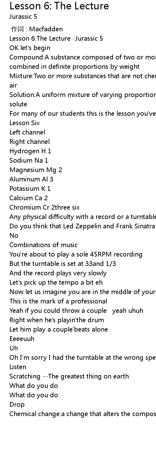 | [00:00.00] | Lesson 6: The Lecture Jurassic 5 |