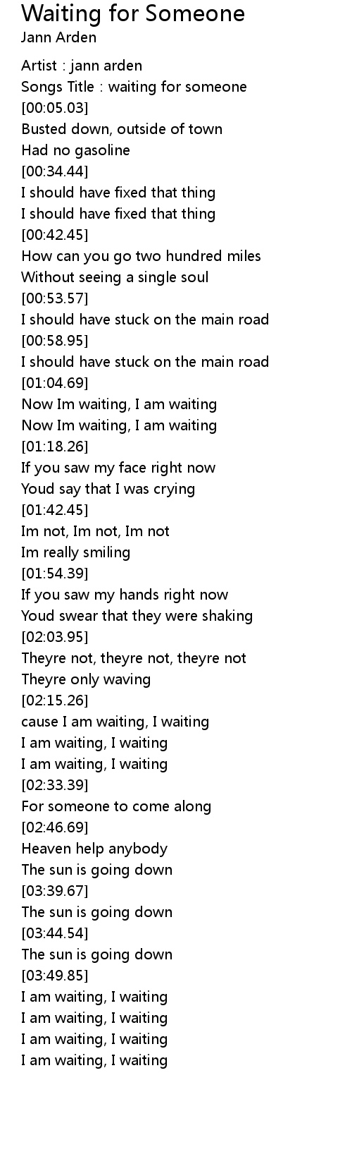 | [01:14.32] | Now Im waiting, I am waiting |