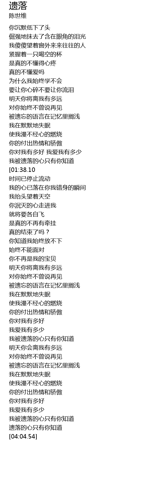 | [03:03.51] | 我被遗落的心只有你知道 |