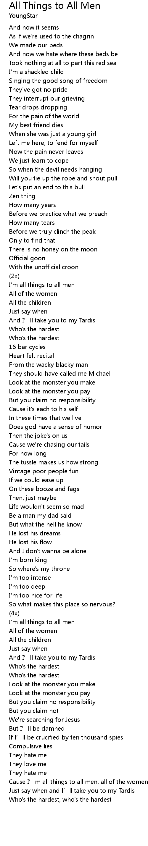| Cause I’m all things to all men, all of the women, all the children | |