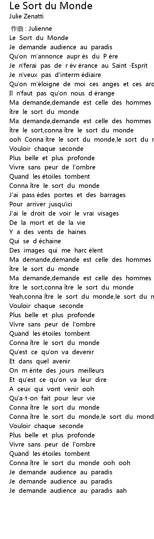 | [00:46.53] | Ma demande, demande est celle des hommes qui veulent conna tre le sort, conna tre le sort du monde |