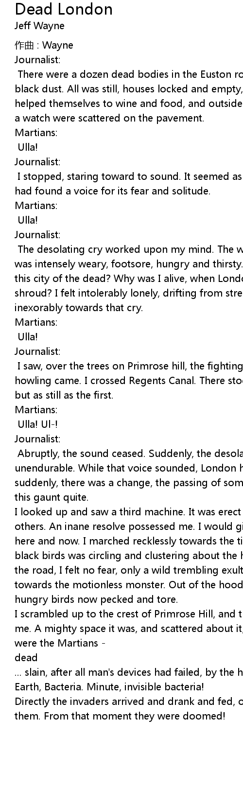 | Abruptly, the sound ceased. Suddenly, the desolation, the solitude, became unendurable. While that voice sounded, London had still seemed alive. Now, suddenly, there was a change, the passing of something and all that remained was this gaunt quite. | |