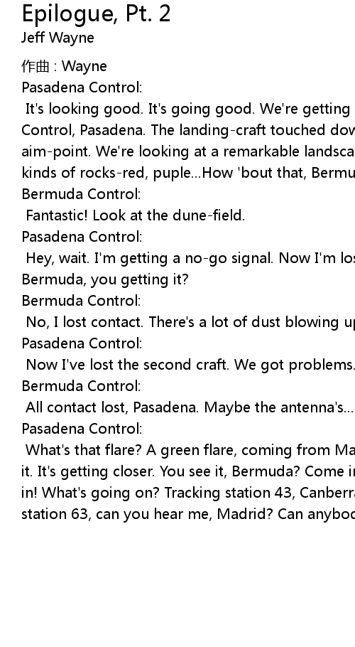 | What' s that flare? A green flare, coming from Mars, kind of a green mist behind it. It' s getting closer. You see it, Bermuda? Come in, Bermuda! Houston, come in! What' s going on? Tracking station 43, Canberra, come in, Canberra! Tracking station 63, can you hear me, Madrid? Can anybody hear me? Come in, Come in... |
