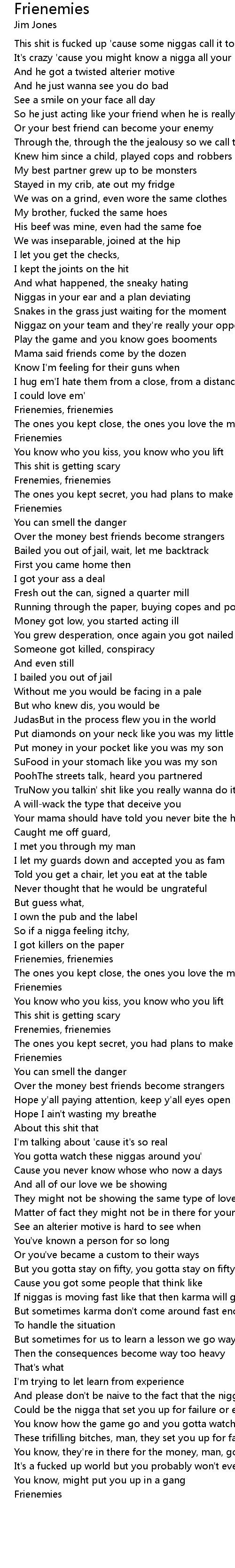 Through the, through the the jealousy so we call those frienemies |