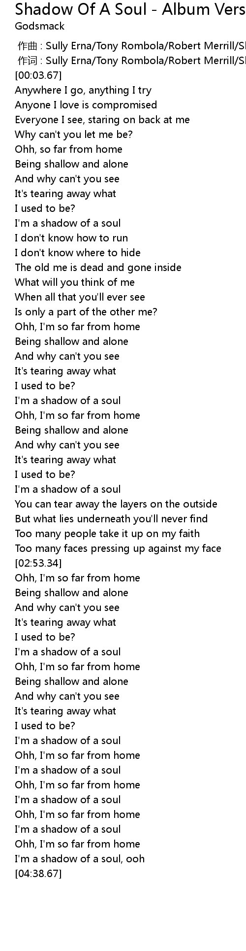 | [04:33.67] | I'm a shadow of a soul, ooh |