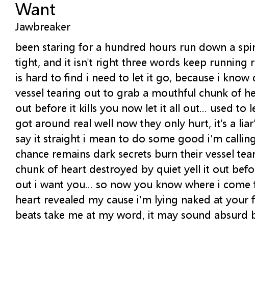 been staring for a hundred hours run down a spiral drain keep mouth clamped tight, and it isn't right three words keep running round my mind but my tongue is hard to find i need to let it go, because i know dark secrets burn their vessel tearing out to grab a mouthful chunk of heart destroyed by quiet yell it out before it kills you now let it all out... used to let rumors do my work they got around real well now they only hurt, it's a liar's quirk this time i gotta say it straight i mean to do some good i'm calling out your name, while the chance remains dark secrets burn their vessel tearing out to grab a mouthful chunk of heart destroyed by quiet yell it out before it kills you now let it all out i want you... so now you know where i come from my secret's come undone my heart revealed my cause i'm lying naked at your feet don't crush the heart that beats take me at my word, it may sound absurd but i want you... |