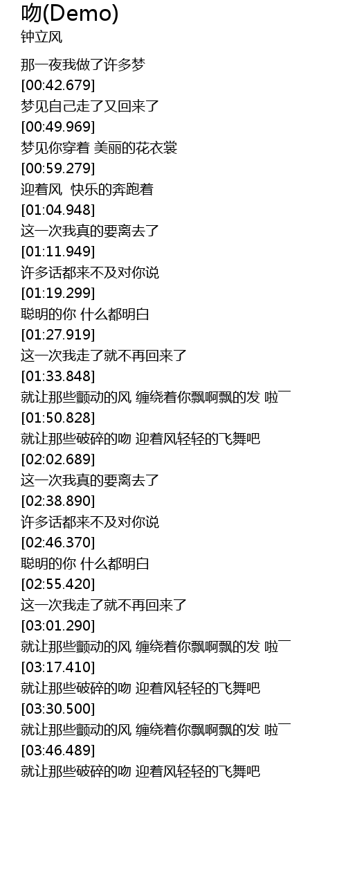 | [03:48.359] | 就让那些破碎的吻 迎着风轻轻的飞舞吧 |