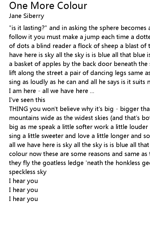 "is it lasting?" and in asking the sphere becomes a line a dotted line and to follow it you must make a jump each time a dotted page a dotted hillside a blast of dots a blind reader a flock of sheep a blast of trumpet shots here - all we have here is sky all the sky is is blue all that blue is is one more colour now a basket of apples by the back door beneath the sweater pegs the autumn leaves lift along the street a pair of dancing legs same as the vendor who likes to sing as loudly as he can and all he says is it suits me fine that's the way