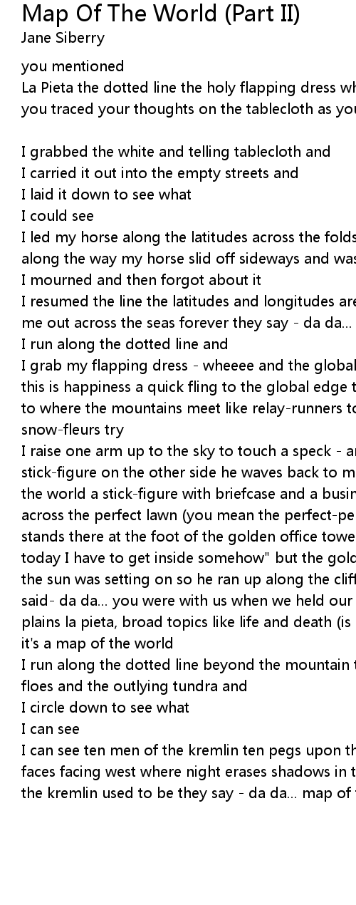 I can see ten men of the kremlin ten pegs upon the plains ten men with stony faces facing west where night erases shadows in the places where the faces of the kremlin used to be they say - da da... map of the world |