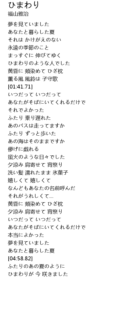 | [03:01.25] | 夕涼み 肩寄せて 宵祭り |