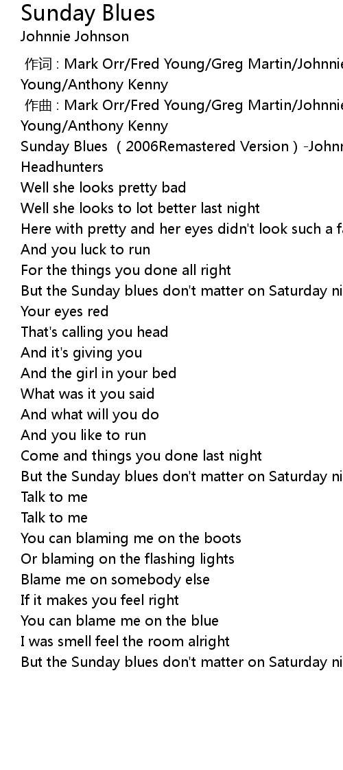 | [00:00.590] | Sunday Blues 2006Remastered Version Johnnie Johnson Kentucky Headhunters |
