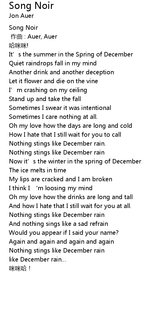 | [02:31.78] | Nothing stings like December rain |