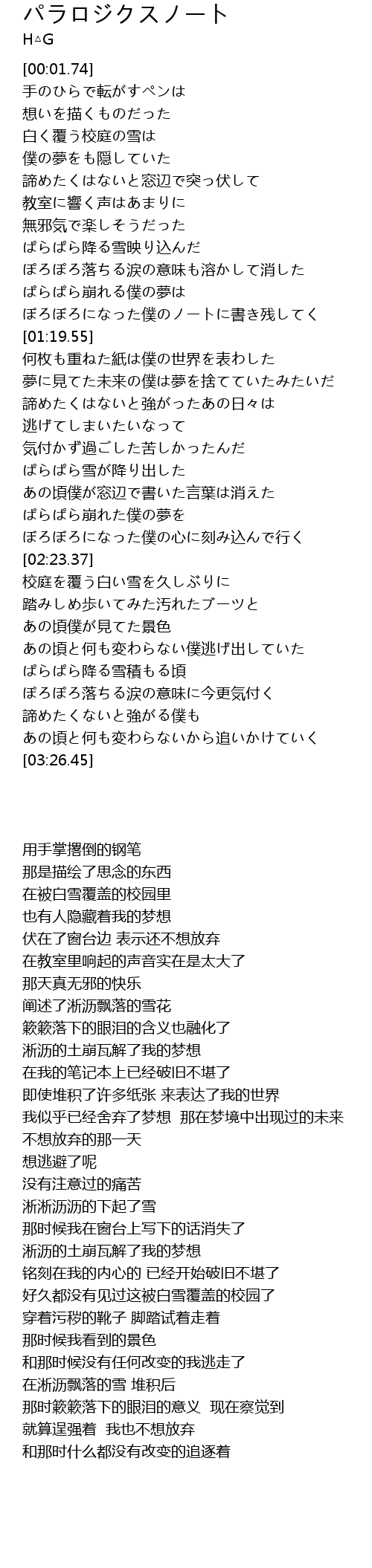 | [01:11.07] | ぼろぼろになった僕のノートに書き残してく |