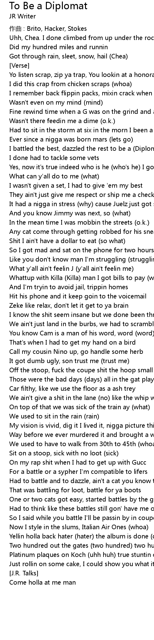 | Yo listen scrap, zip ya trap, You lookin at a honorary (Diplomat) | |