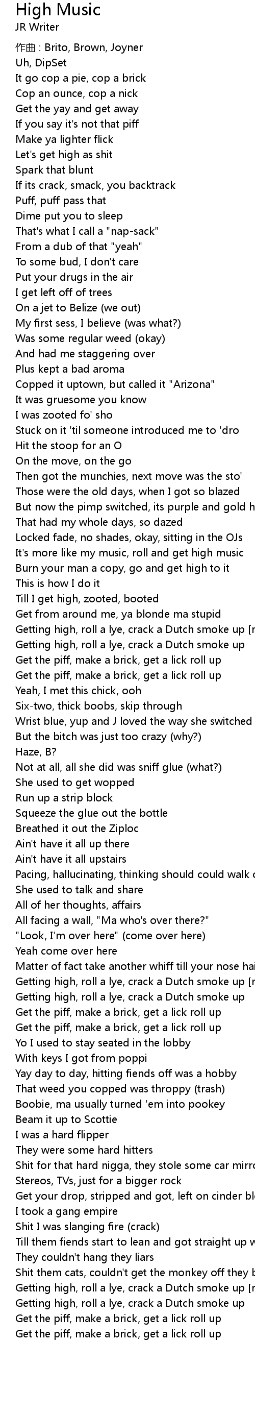 | Getting high, roll a lye, crack a Dutch smoke up repeated | |