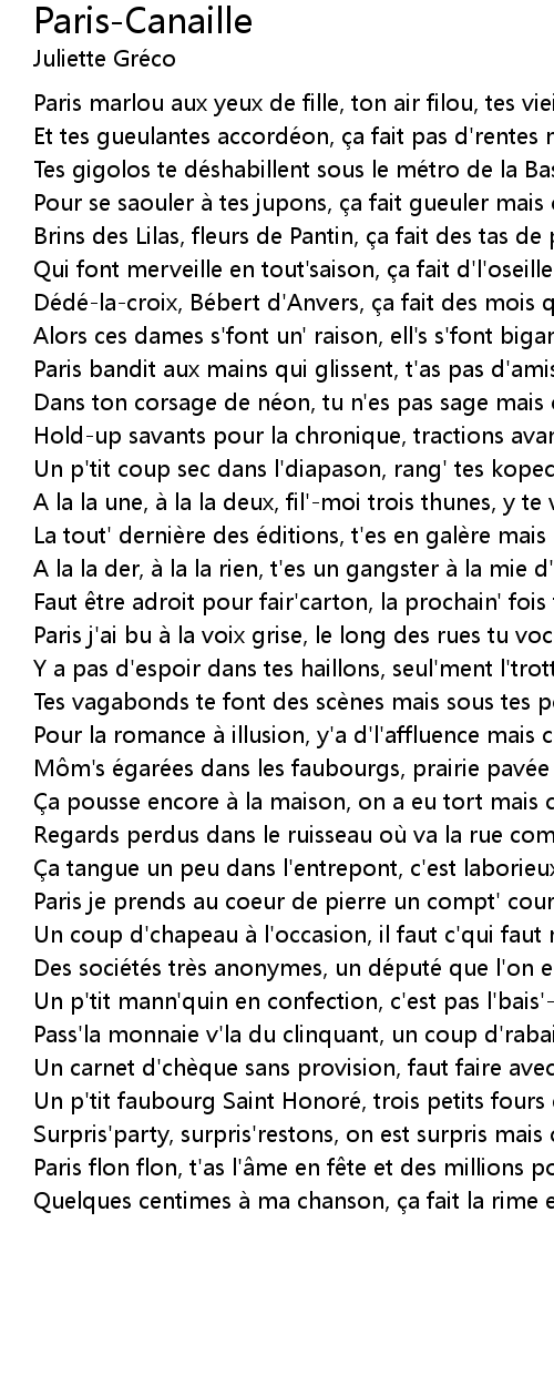 | Paris flon flon, t'as l'âme en fête et des millions pour tes poètes | |
