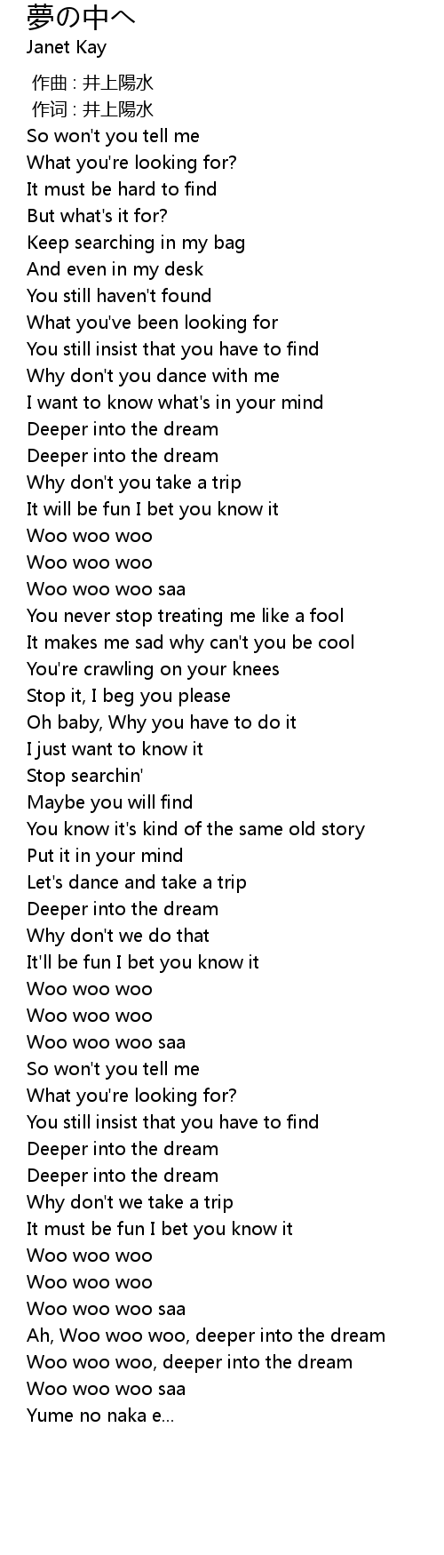 | [02:11.45] | Woo woo woo, deeper into the dream |