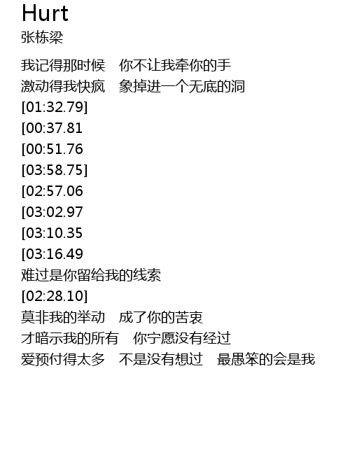 | [03:28.58][03:02.97][02:05.75][01:08.56] | hurt me so long zhè yí ge rén bù gāi shì wǒ |