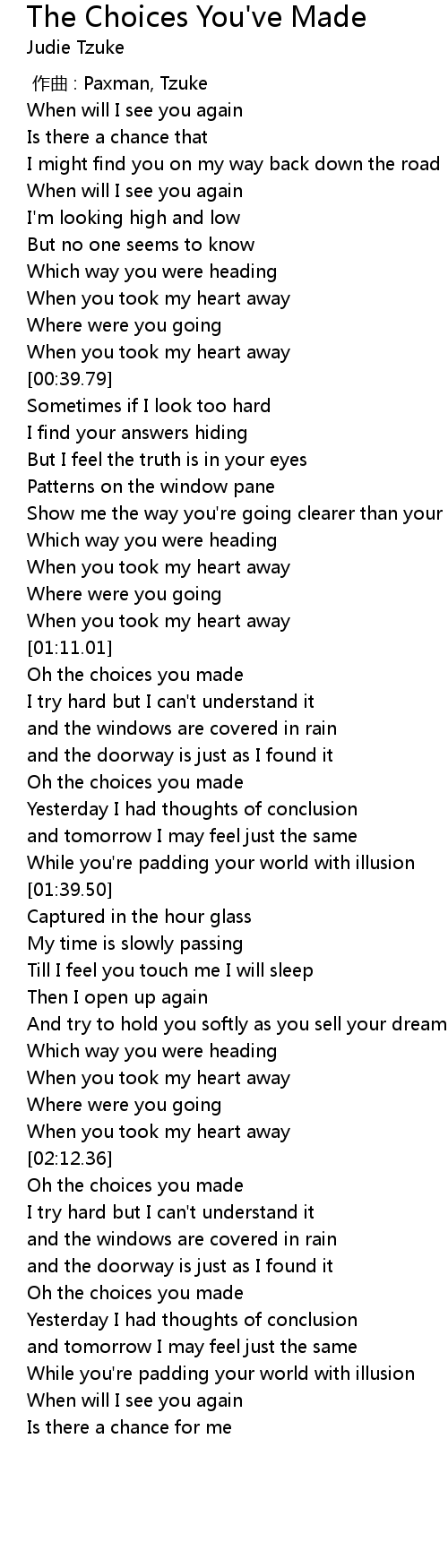 | [01:12.04] | Oh the choices you made |