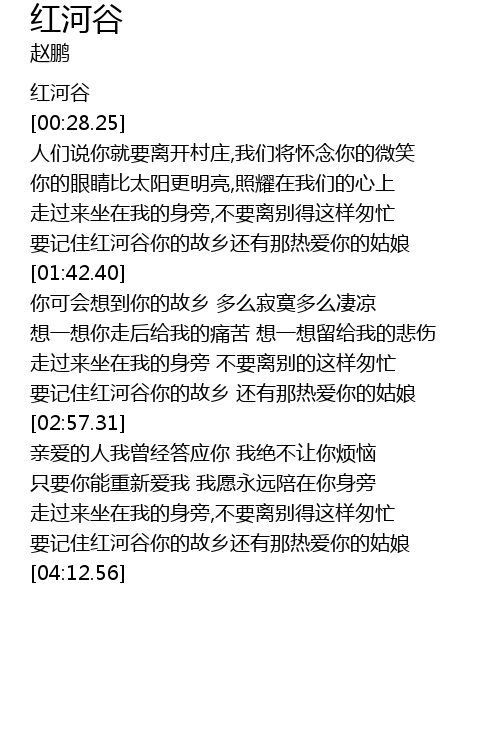 | [03:58.92] | 要记住红河谷你的故乡还有那热爱你的姑娘 |