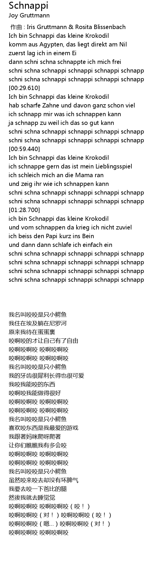 | [01:37.560] | ich bin Schnappi das kleine Krokodil |