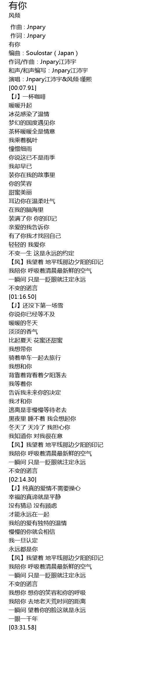 | [00:03.57] | 作词/作曲:Jnpary江沛宇 |