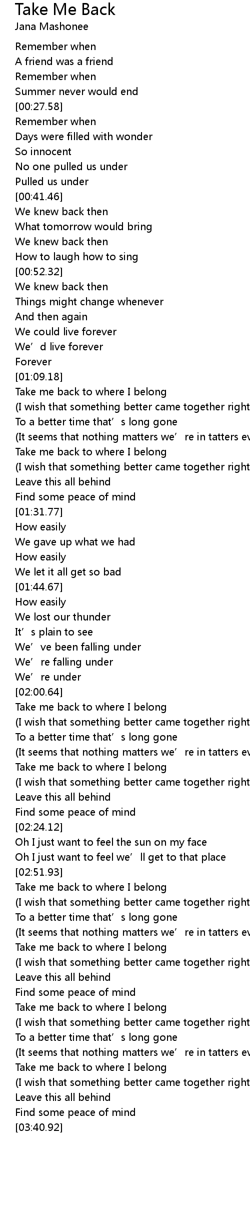 | [03:00.13] | Take me back to where I belong |