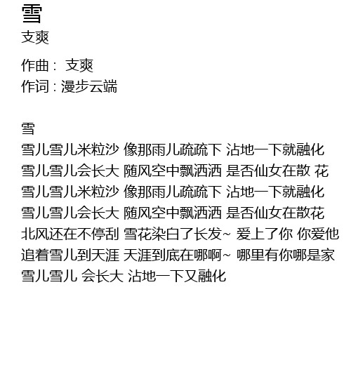 | 雪儿雪儿会长大 随风空中飘洒洒 是否仙女在散 花 | |