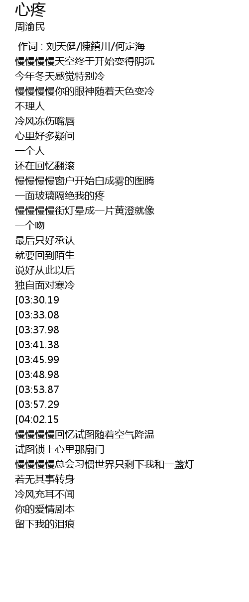 | [04:31.14][03:33.08][01:42.97] | 我的心冰封一样冷 |