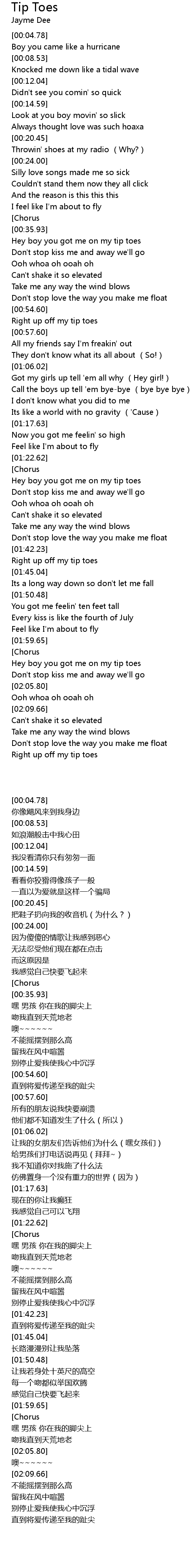 | [00:36.49] | Hey boy you got me on my tip toes |