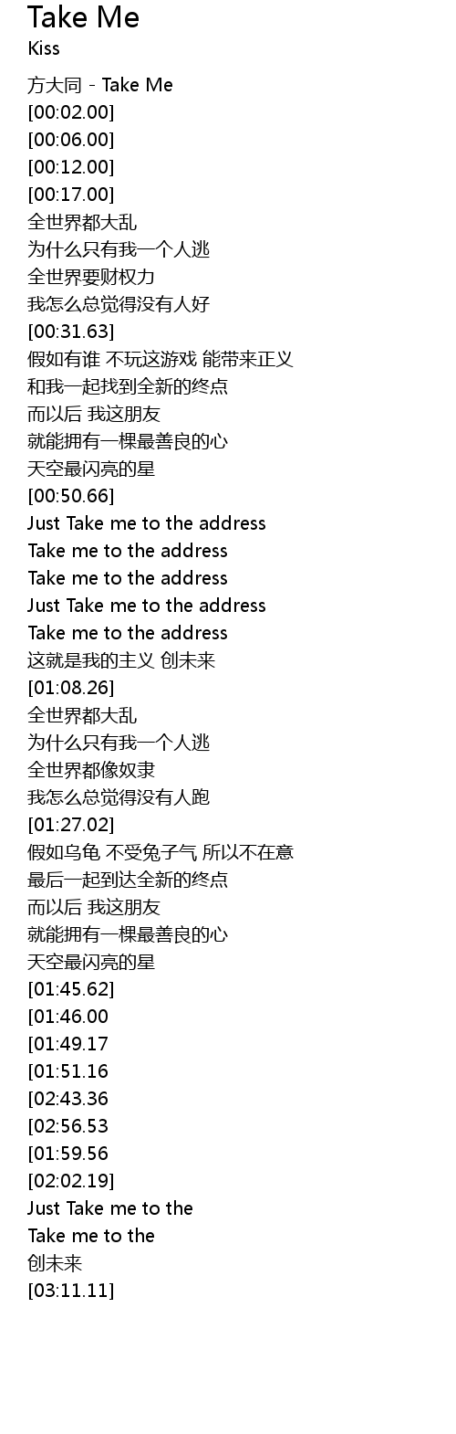| [02:57.98][02:56.53][02:48.79][02:46.47][01:57.48] | Take me to the address |