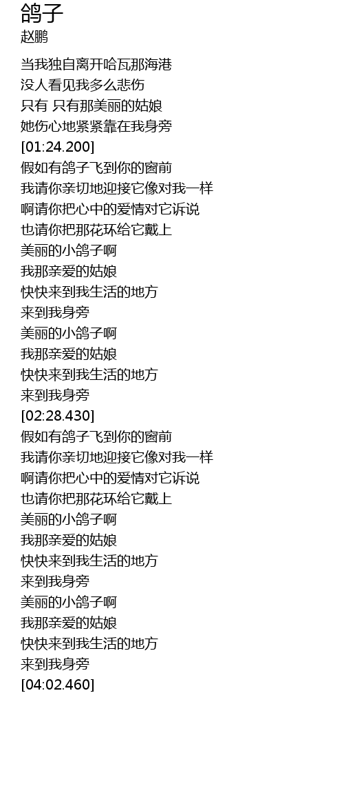 | [01:56.810] | 美丽的小鸽子啊 |