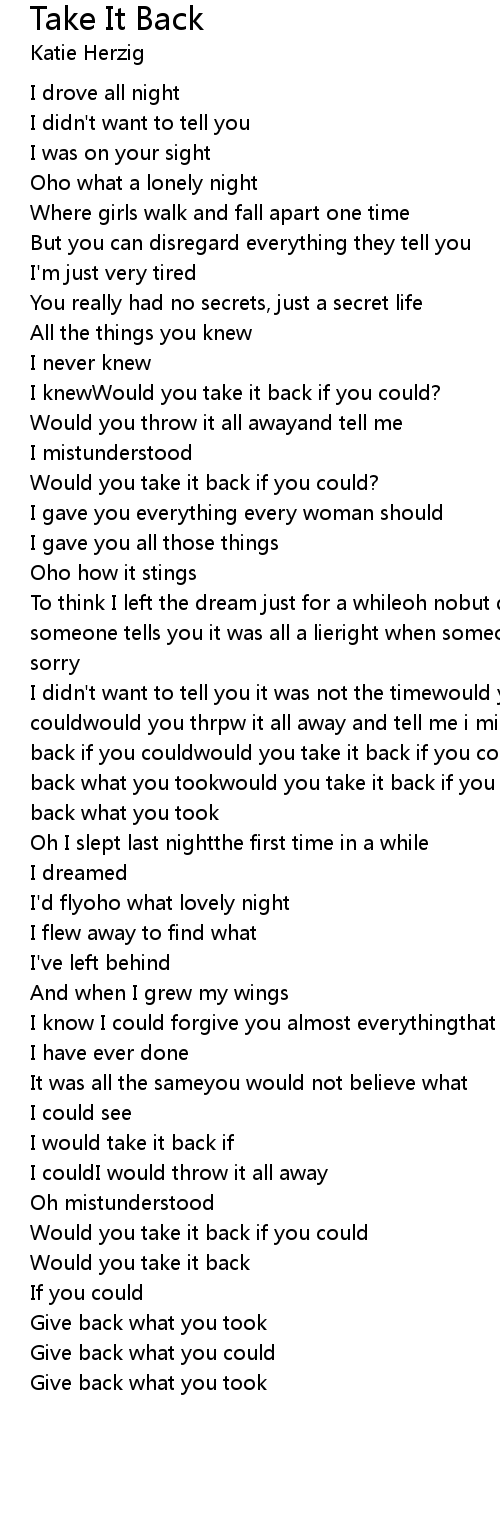 I didn't want to tell you it was not the timewould you take it back if you couldwould you thrpw it all away and tell me i misunderstoodwould you take it back if you couldwould you take it back if you couldgive back what you tookgive back what you tookwould you take it back if you couldgive back what you tookgive back what you took |