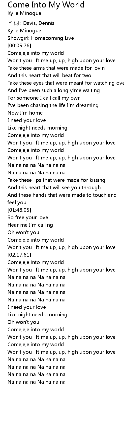 | [02:04.65] | Come,e,e into my world |