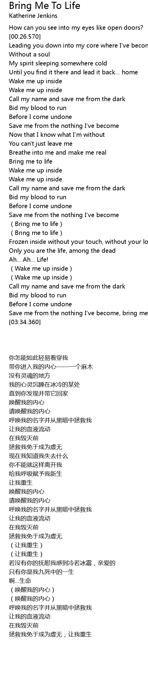 | [03:23.750] | Save me from the nothing I' ve become, bring me to life! |