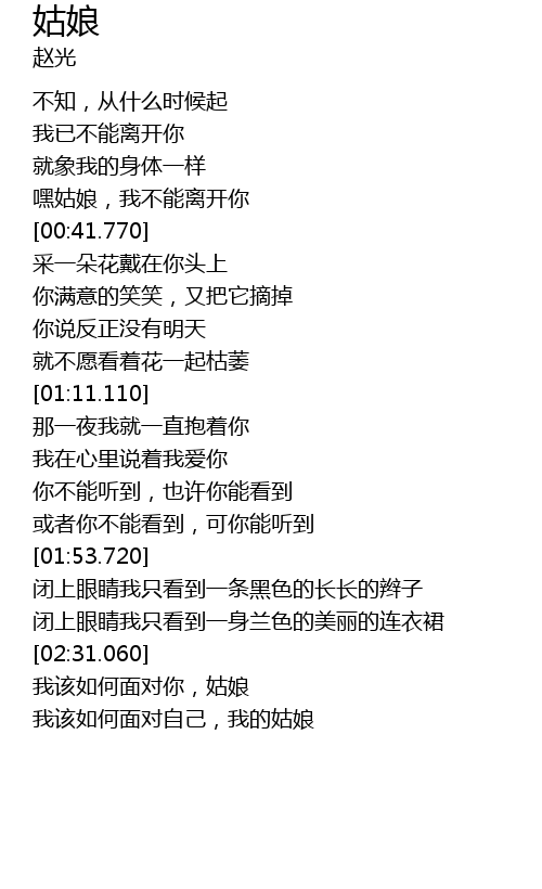 | [00:35.180] | hēi gū niáng, wǒ bù néng lí kāi nǐ |