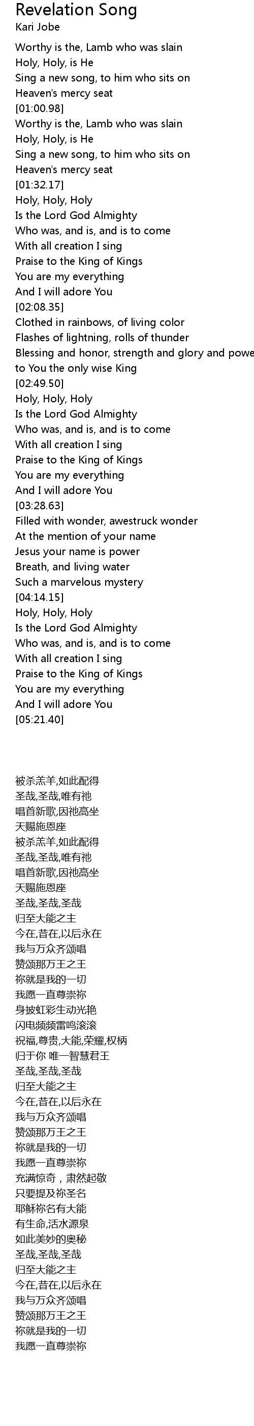 | [01:02.44] | Worthy is the, Lamb who was slain |