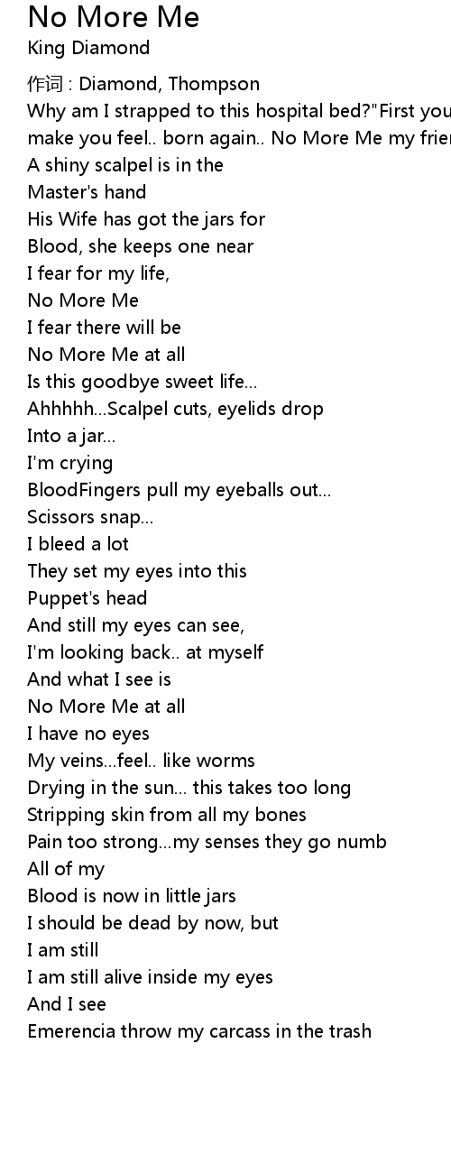| Why am I strapped to this hospital bed?"First your eyes, then your skinWe will make you feel.. born again.. No More Me my friend" | |