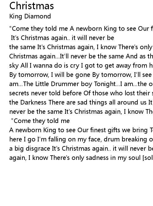 "Come they told me A newborn King to see Our finest gifts we bring To lay before the King...Oh when we come" [solo: Mike] It's Christmas again.. it will never be the same It's Christmas again, I know There's only sadness in my soul It's Christmas again...It'll never be the same And as the snow is falling from the sky All I wanna do is cry I got to get away from here I gotta get away........ By tomorrow, I will be gone By tomorrow, I'll see the sun again But tonight...I am...The Little Drummer boy Tonight...I am...the one who will destroy The secrets never told before Of those who lost their souls There are sad things in the Darkness There are sad things all around us It's Christmas again.. it will never be the same It's Christmas again, I know There's only sadness in my soul It's Christmas again... It'll never be the same [solo: Andy] "Come they told me A newborn King to see Our finest gifts we bring To lay before the King..." Now here I go I'm falling on my face, drum breaking on the stage Oh My God it's such a big disgrace It's Christmas again.. it will never be the same It's Christmas again, I know There's only sadness in my soul [solo: Mike] |