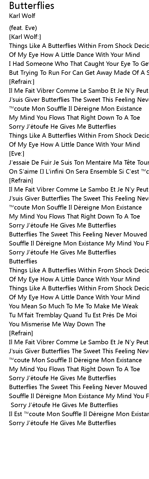 | Butterflies The Sweet This Feeling Never Mouved Along Il Est coute Mon Souffle Il De reigne Mon Existance My Mind You Flows That Right Down To A Toe | |