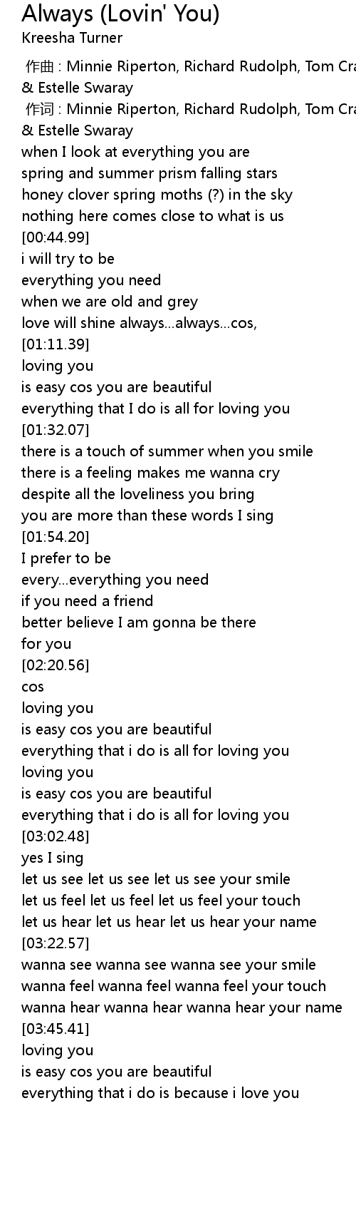| [00:01.00] | zuò cí : Minnie Riperton, Richard Rudolph, Tom Craskey, Devon Harris Estelle Swaray |