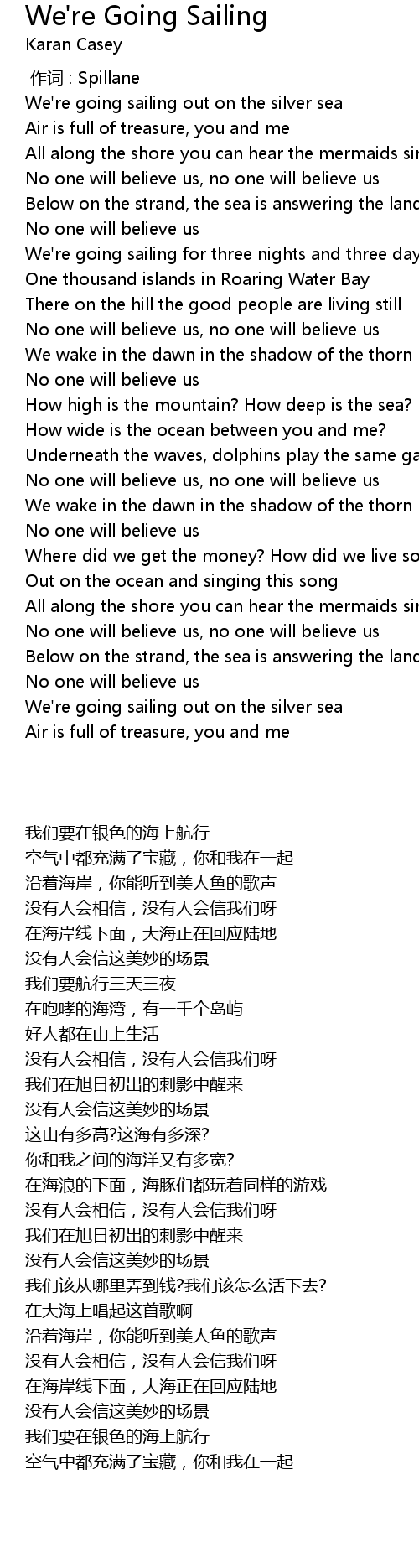 | [00:19.06] | We' re going sailing out on the silver sea |