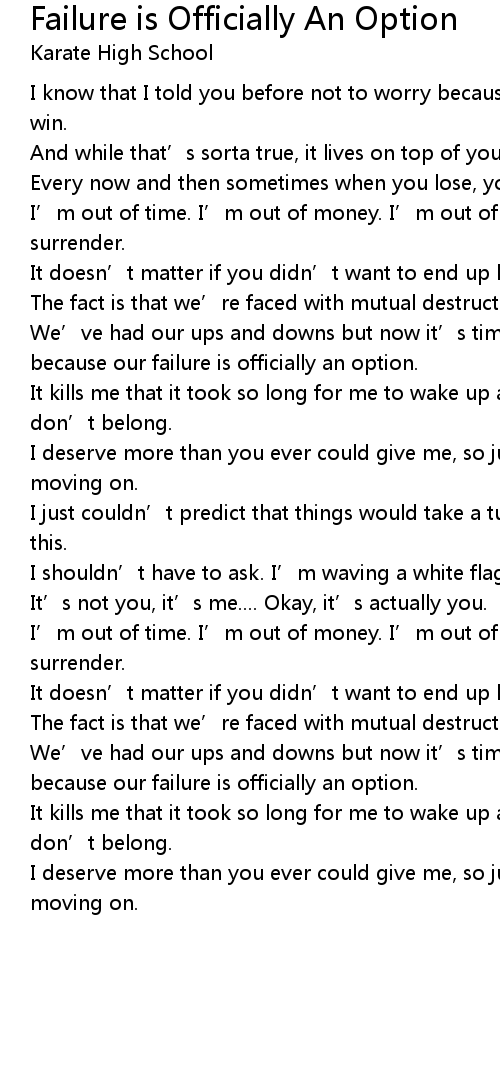 | I' m out of time. I' m out of money. I' m out of steam. I give up, I surrender. | |