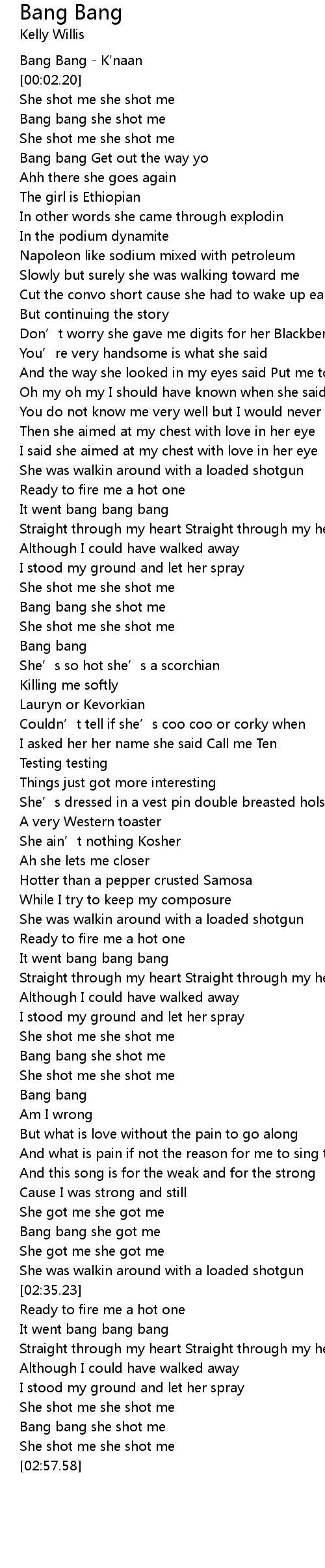 | [02:31.23] | Bang bang she got me |